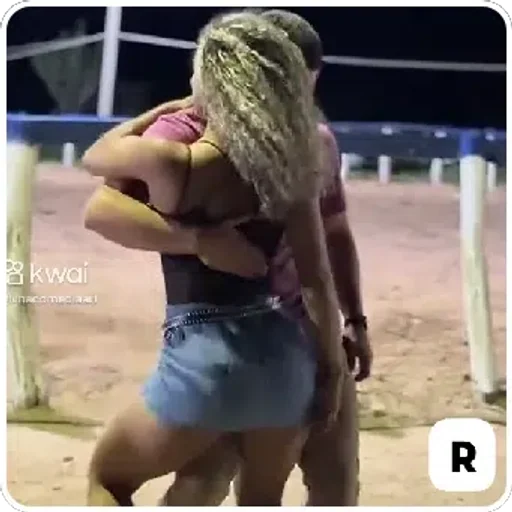 Um casal se abraçando em um campo de vôlei de praia à noite, a mulher tem cabelo loiro e está usando uma minissaia jeans e uma blusa rosa, o homem está usando uma camisa rosa.