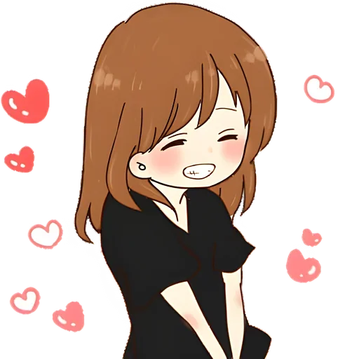 Garota de cabelos castanhos com bochechas rosadas e olhos fechados, vestindo uma blusa preta, rodeada de corações vermelhos e rosa.