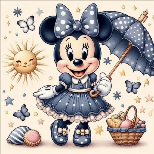 Minnie Mouse vestida de azul com um chapéu de flores e guarda-chuva, sorrindo e segurando uma cesta de ovos de Páscoa, rodeada de estrelas, borboletas e um sol feliz.
