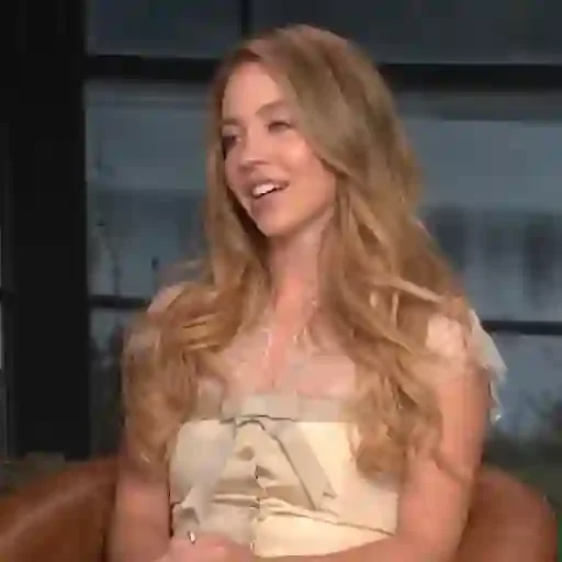 Uma jovem mulher com cabelo castanho claro e um vestido bege sorri enquanto olha para a esquerda.