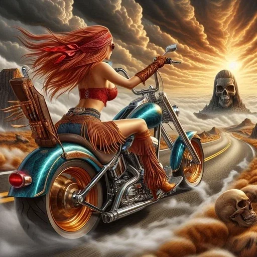 Mulher de cabelos vermelhos em uma motocicleta azul, com o sol se pondo ao fundo e uma caveira no horizonte. Ela está de costas, usando um biquíni vermelho e shorts de franja.