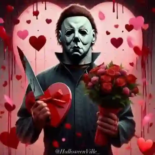 Michael Myers, o assassino mascarado do Halloween, segurando um buquê de rosas vermelhas e uma faca, com corações vermelhos e rosa ao fundo.
