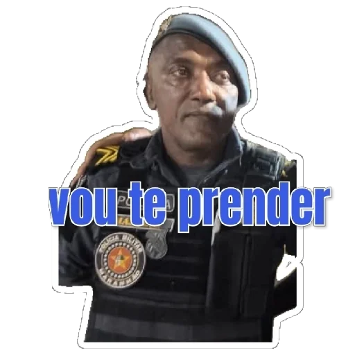 Um policial fardado com um quepe, com a frase 'vou te prender' sobreposta em azul.