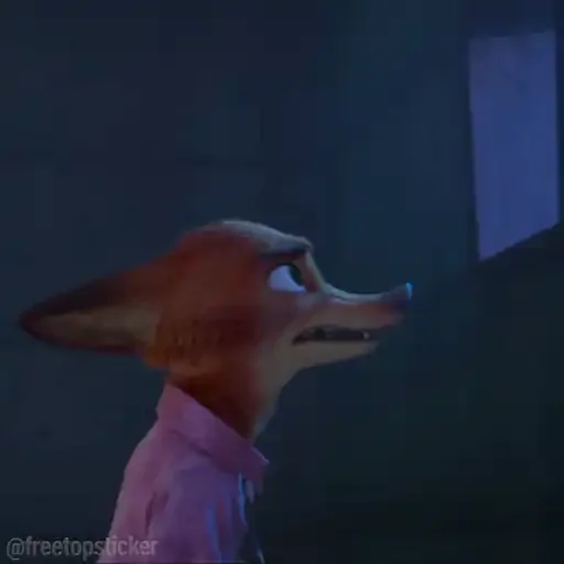 Um desenho de uma raposa com expressão surpresa ou confusa, usando uma camisa rosa, contra um fundo escuro.
