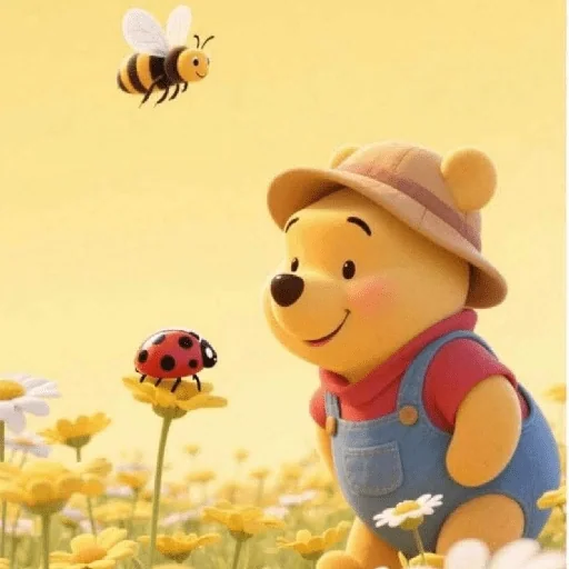 Winnie Pooh, um urso de pelúcia amarelo, usando um chapéu de palha e macacão azul, observa uma joaninha preta e vermelha sobre uma flor amarela, enquanto uma abelha voa acima, em um campo de flores amarelas e brancas.