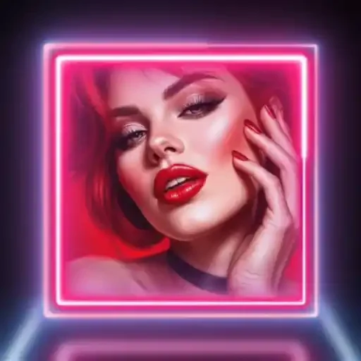 Uma mulher loira com maquiagem pesada e lábios vermelhos, tocando o rosto com a mão, dentro de um quadro rosa neon.