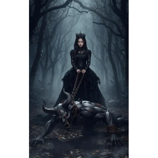 Uma mulher com cabelo preto e coroa sentada em um touro preto com chifres em uma floresta escura e nebulosa.
