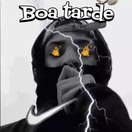 Um homem com um capuz e máscara facial, olhos com chamas e um raio no rosto, com o texto 'Boa tarde' em cima. Ele está com a mão na boca e tem um logotipo da Nike.