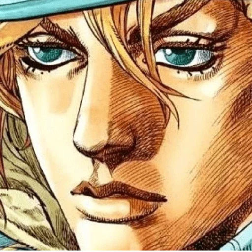 Personagem de anime com cabelos loiros e chapéu azul, expressão séria, em meio a linhas verdes e fundo cinza com chamas…