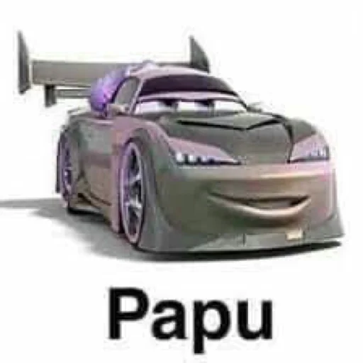 Um carro de corrida com um grande spoiler na parte traseira e o texto 'Papu' embaixo.