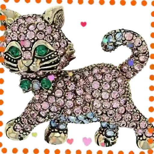 Gato decorado com pedras preciosas coloridas, olhos verdes e colar com pingentes. Fundo branco com borda laranja.
