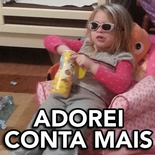 Menina loira com óculos de sol sentada em uma poltrona rosa, segurando uma garrafa amarela, com o texto "ADOREI CONTA MAIS" sobreposto.