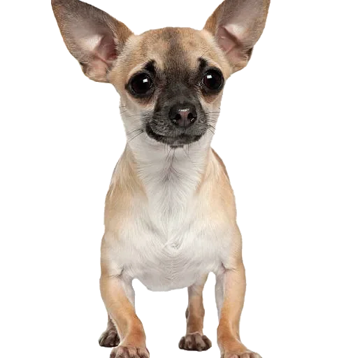 Um cachorro Chihuahua com orelhas grandes e focinho preto, corpo castanho e branco.