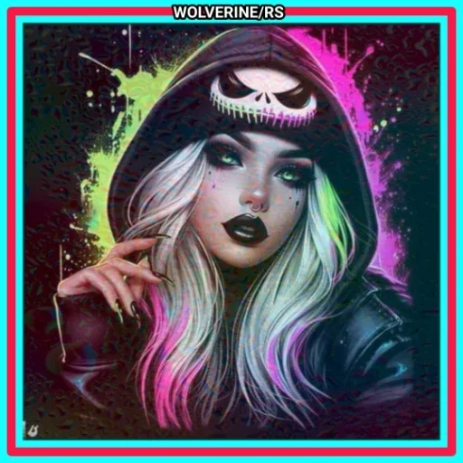 Mulher com cabelos loiros e uma jaqueta preta, usando um capuz com uma caveira branca. Fundo colorido com efeitos de spray.