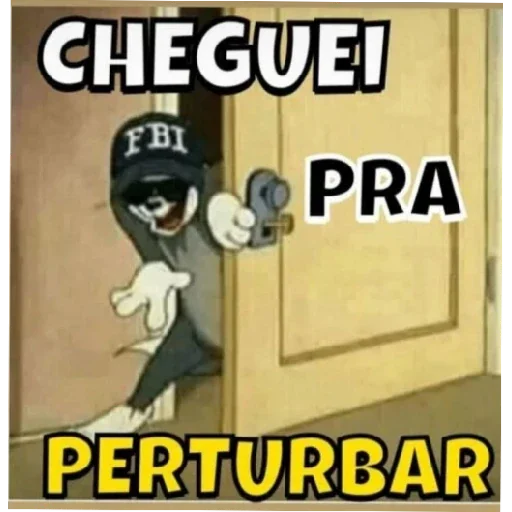 Um gato cinza com um boné preto do FBI está saindo de trás de uma porta amarela, com um olhar malicioso. O texto 'CHEGUEI PRA PERTURBAR' está escrito em letras grandes e coloridas.