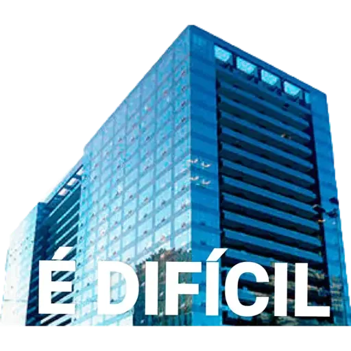 Um prédio alto e moderno com muitas janelas e É DIFÍCIL em letras grandes na frente.