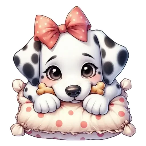 Um cachorro dálmata fofinho com uma faixa rosa na cabeça está deitado em uma almofada rosa com manchas rosadas, segurando dois ossos na boca.
