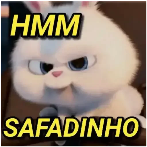 Um gato branco com expressão séria e olhos azuis, com o texto 'HMM SAFADINHO' em letras amarelas.