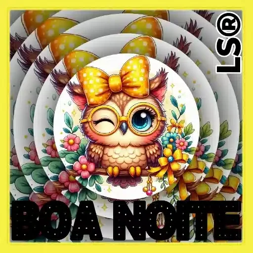 Um desenho de uma coruja marrom com um laço amarelo no cabelo e óculos de sol, com a inscrição 'BOA NOITE' em letras pretas.