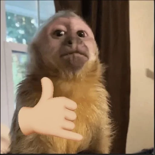 Um macaco com expressão séria faz um gesto de 'tudo bem' com a mão. Ele está em frente a uma janela com cortina.