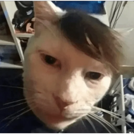 Gato branco com franja preta na testa, parecendo humano, com expressão séria e bigodes longos.