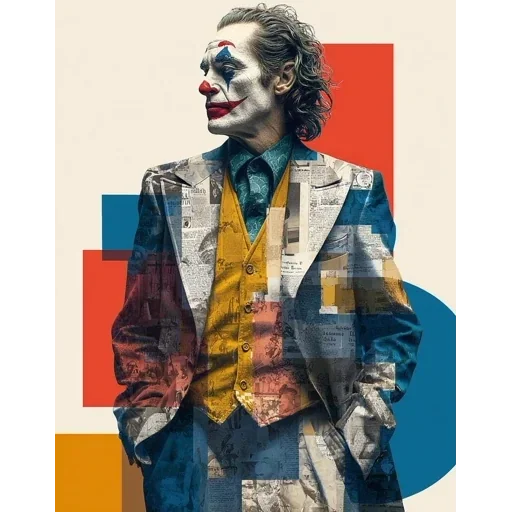 Um homem com maquiagem de palhaço, parecido com o Coringa, em um terno xadrez com colete amarelo, contra um fundo de formas geométricas coloridas.