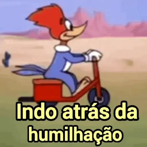 Um pica-pau cartoon de azul e vermelho está sentado em uma scooter vermelha, com o texto 'Indo atrás da humilhação' em amarelo com contorno preto.