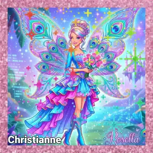 Uma fada colorida com asas de pavão e um vestido azul e rosa, segurando flores, em um fundo brilhante e estrelado. O nome 'Christianney' aparece no canto inferior esquerdo.