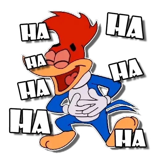 Um desenho do Woody Woodpecker, um pica-pau de madeira vermelho com bico laranja, vestindo um macacão azul, com a expressão de boca aberta e riso, rodeado por várias vezes a palavra 'HA' em letras brancas.
