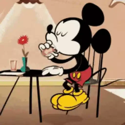Mickey Mouse sentado à mesa com uma flor vermelha em um vaso, com um copo ao lado, com expressão de desânimo ou tédio.