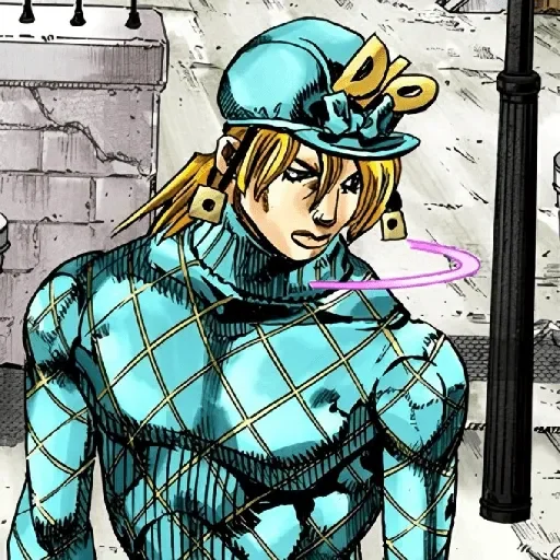Personagem de anime com cabelo loiro e roupa azul-turquesa xadrez, usando um chapéu com 'Dio' em letras douradas.