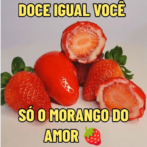 Um monte de morangos frescos com texto amarelo que diz 'DOCE IGUAL VOCÊ SÓ O MORANGO DO AMOR'.