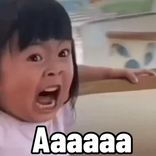 Menina com expressão de surpresa ou susto, boca aberta e olhos arregalados. Legenda 'Aaaaaa' em branco.