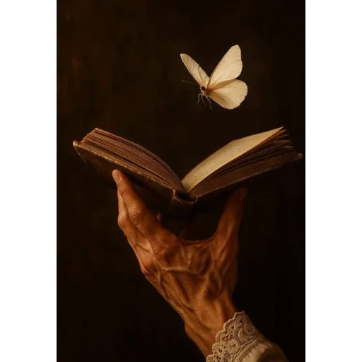 Uma mão segurando um livro aberto com uma borboleta saindo dele. A mão tem uma pulseira e o fundo é escuro.