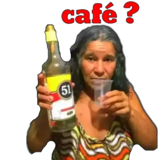 Uma mulher de cabelo preto e grisalho, com uma blusa listrada colorida, segura uma garrafa de cerveja 51 e um copo, com a legenda 'café?' em vermelho.