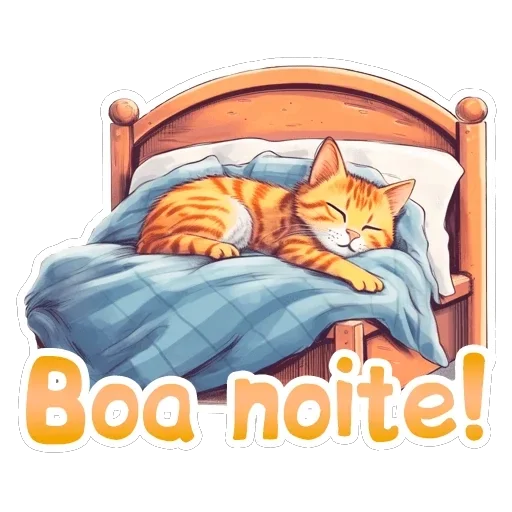 Um gato laranja deitado na cama com um cobertor azul, dormindo. Abaixo dele, está escrito 'Boa noite!'