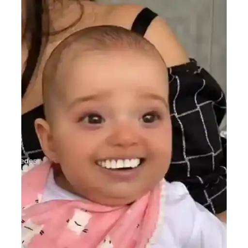 Um bebê com sorriso largo e dentes aparecendo, usando uma bandana rosa com padrão de coelhos, com uma mulher ao fundo.