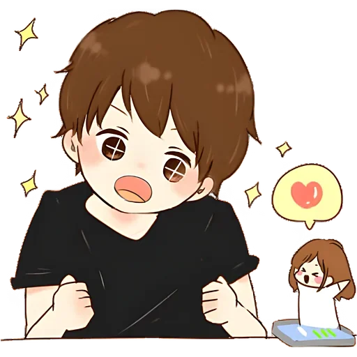Menino de cabelo castanho com expressão surpresa e bocado na boca, com estrelas ao redor. Outra menina ao fundo com um coração no pensamento.