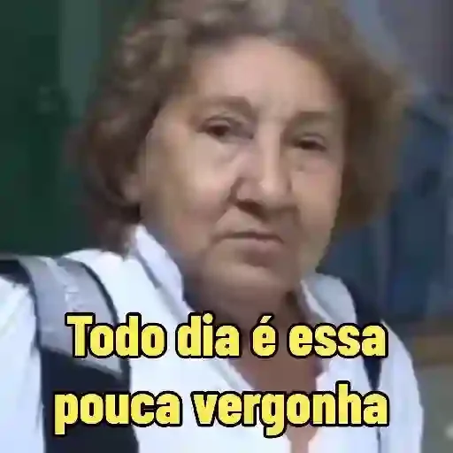 Uma mulher mais velha com expressão séria e cabelos castanhos, vestindo uma camisa branca e um casaco preto, com o texto 'Todo dia é essa pouca vergonha' sobreposto em amarelo.