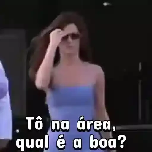 Uma mulher de cabelo castanho e vestido azul, com óculos escuros, fazendo um gesto com a mão. Ela diz 'Tô na área, qual é a boa?'