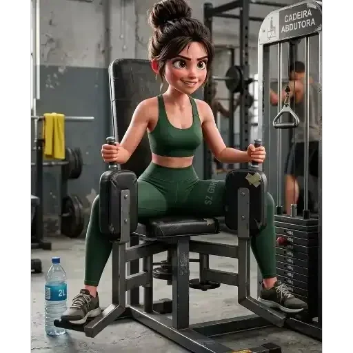 Uma mulher com cabelo castanho preso em um coque está sentada em uma máquina de musculação em uma academia, vestindo uma roupa de ginástica verde. Ela tem um olhar sério e determinado.