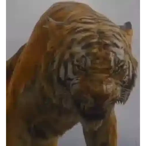 Um tigre marrom com listras pretas olhando para baixo com um fundo cinza.