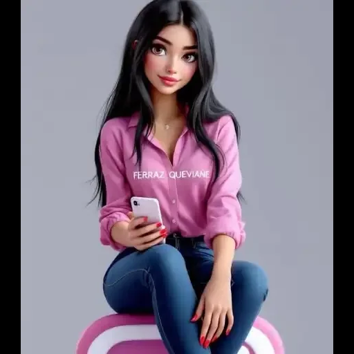 Uma jovem mulher sentada em um objeto rosa e branco, vestindo uma blusa rosa e jeans, segurando um celular branco.