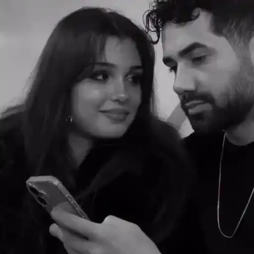 Um casal olhando para um celular, ambos com expressões neutras, em preto e branco.