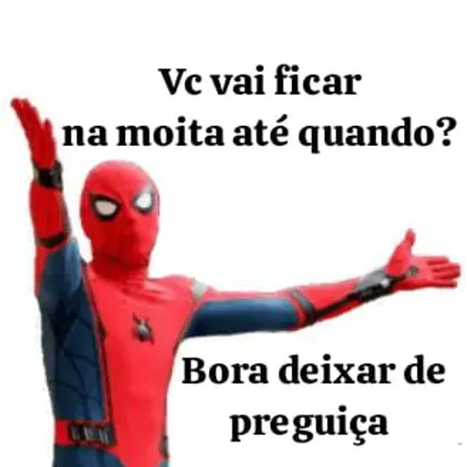 Homem-Aranha com os braços abertos e levantados, com texto em português: 'Ve vai ficar na moita até quando? Bora deixar de preguiça'.