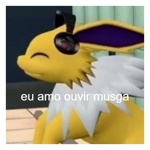 Um sticker do pokémon Jolteon com um olho fechado e expressão de felicidade, com o texto "eu amo ouvir musga" sobreposto.