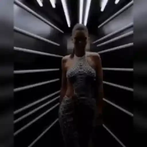Mulher loira em um corredor escuro com luzes brancas direcionadas a ela, vestindo um look preto.
