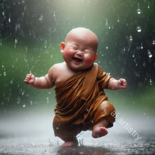 Um bebê monge budista ri enquanto corre na chuva, vestindo uma túnica marrom. Ele parece muito feliz.
