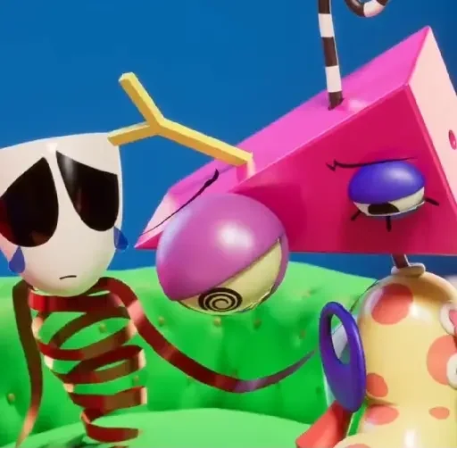 Três personagens coloridos e engraçados, um esqueleto, uma esfera roxa e uma figura amarela com manchas rosadas, em um cenário verde e azul.