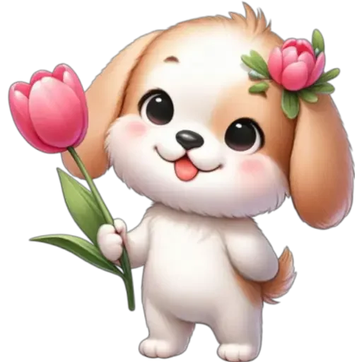 Um cachorrinho fofinho com flores na orelha e um tulipão rosa na pata, com uma expressão feliz e a língua para fora.